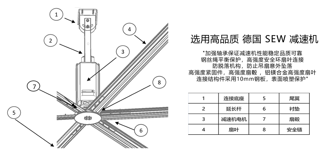 Apogee 減速機采用德國SEW減速一體機,SKF加強型軸承,進口雙油封,低噪音,可靠性高,相比感應電機吊扇,重量減少25KG±,技術(shù)成熟產(chǎn)品,廣受市場好評。