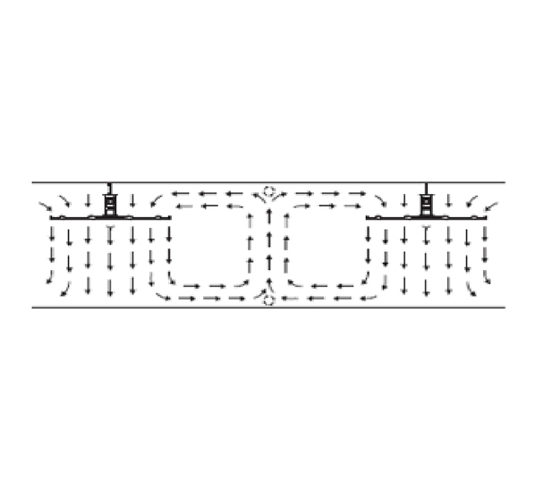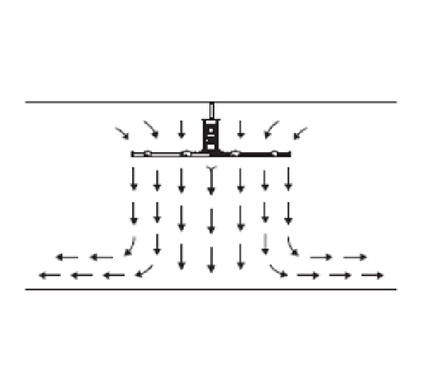氣流到達(dá)地面后偏轉(zhuǎn)向外輻射, 氣流遇到墻或設(shè)備阻擋物,氣流開(kāi)始向上偏轉(zhuǎn)達(dá)到屋頂, 向上的氣流向風(fēng)扇上方的低壓區(qū)域然后在將其拉向地板。這個(gè)類(lèi)似對(duì)流。