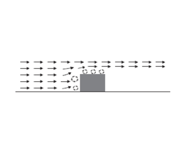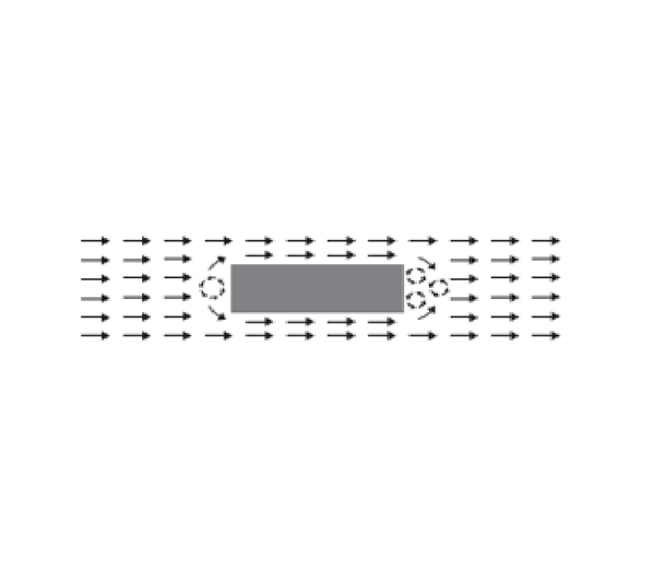 地面的障礙物會(huì)阻礙空氣流動(dòng), 小的或流線型障礙物不會(huì)阻塞太多的空氣流動(dòng), 但當(dāng)氣流遇到大的障礙物,氣流會(huì)失去部分動(dòng)力,并在部分區(qū)域產(chǎn)生空氣停滯(沒(méi)有風(fēng))。氣流通過(guò)大障礙物,空氣流會(huì)改變方向向上, 障礙物后面將不會(huì)有氣流通過(guò)。
