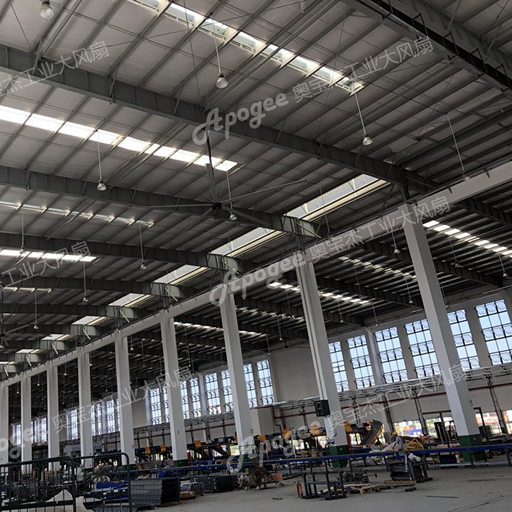 示例圖為湖南一家國有企業(yè)生產(chǎn)機電零部件車間,典型的鋼結(jié)構(gòu)建筑。長度150米, 寬度72米面積10800平米共三跨。 屋面離地高度15米,在沒有吊扇改造前,工廠采用98臺工業(yè)小風(fēng)扇(強力風(fēng)扇,牛角扇)改善員工工作環(huán)境。 然而高溫季節(jié),環(huán)境溫度34-39度時, 部分小風(fēng)扇應(yīng)用覆蓋距離和面積有限, 部分員工近距離靠著小風(fēng)扇長時間強風(fēng)環(huán)境下產(chǎn)生不適反應(yīng),原有的通風(fēng)降溫不能解決問題, 另外隨著工廠安全管理需要小風(fēng)扇由于電纜和潛在靠近旋轉(zhuǎn)扇葉的風(fēng)險也不適應(yīng)工廠未來發(fā)展工廠需要有一個性價比高的通風(fēng)降溫解決方案, 根據(jù)工廠要求, 奧寶杰實地了解原有車間環(huán)境, 從廠房面積, 高度, 設(shè)備人員布局的整體考慮,優(yōu)化吊扇布局和氣流, 使用了18臺奧寶杰(Apogee) TM-7300 (直徑7.3米)進行環(huán)境改善。
